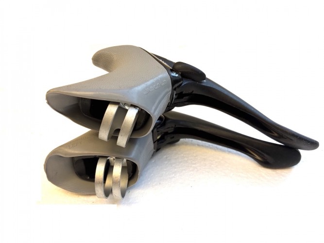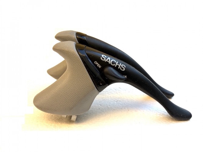 Ein Paar originale Sachs Aero Bremshebel mit passenden Griffgummis, hergestellt von Modolo. Die Hebel stammen aus den 1980er-/1990er-Jahren und sind ideal für den Aufbau oder die Restaurierung eines Vintage-Rennrads.