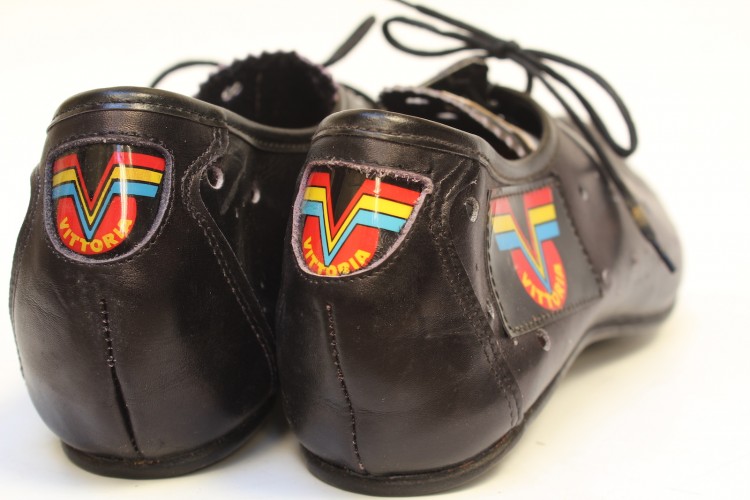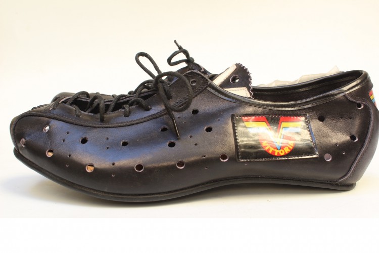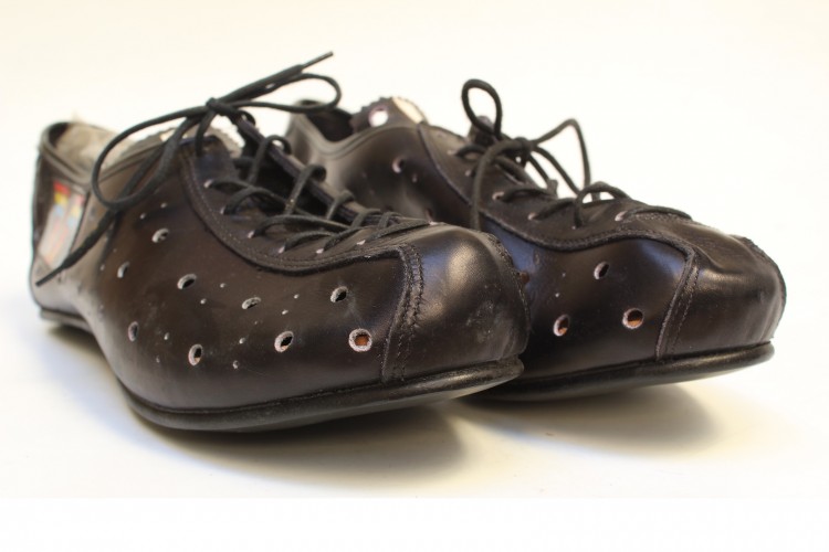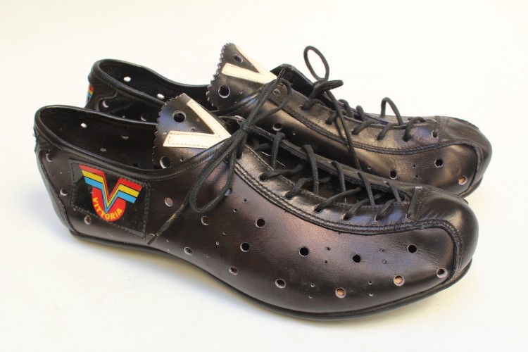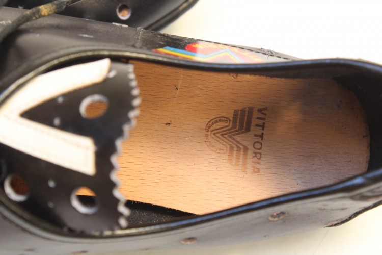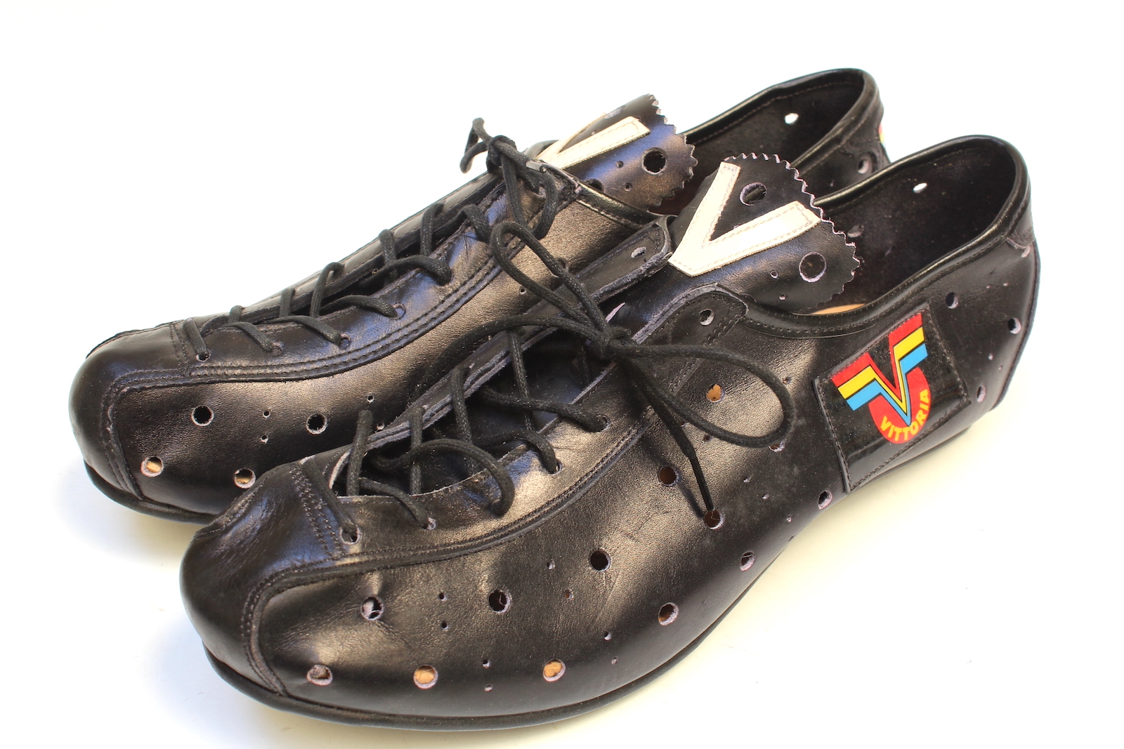 Ein paar klassische Leder Rennrad Schuhe in DE Größe 41 von Vittoria. Die Sohlen sind aus Holz. Die passenden Schuhplatten gibt es dazu. Sie passen an klassische Rennradpedale mit Pedalhaken und -riemen, wie sie in den 60/70 und Anfang der 80er Jahre gefahren wurden.